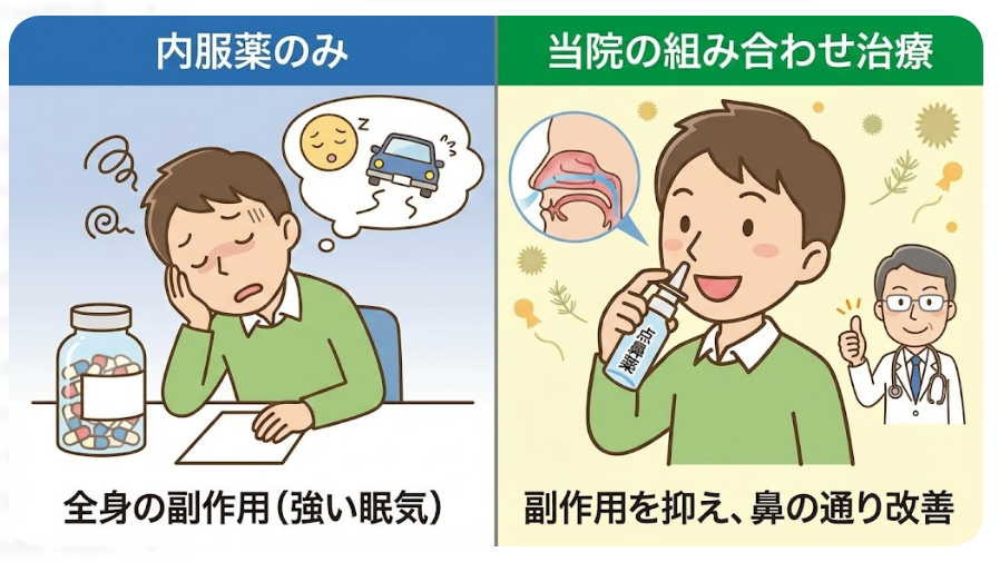 内服薬だけで解決しようとすると眠気が強くなりがちですが、当院では症状に応じて「予防のための点鼻薬」や「鼻閉を強力に抑える点鼻ステロイド薬」を適切に組み合わせます。