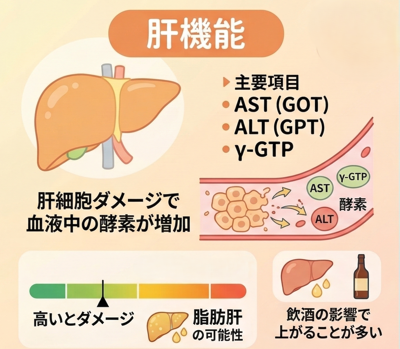 これらは肝臓の細胞がダメージを受けたときに血液中に増える酵素で、肝臓の状態を知る目安になります。