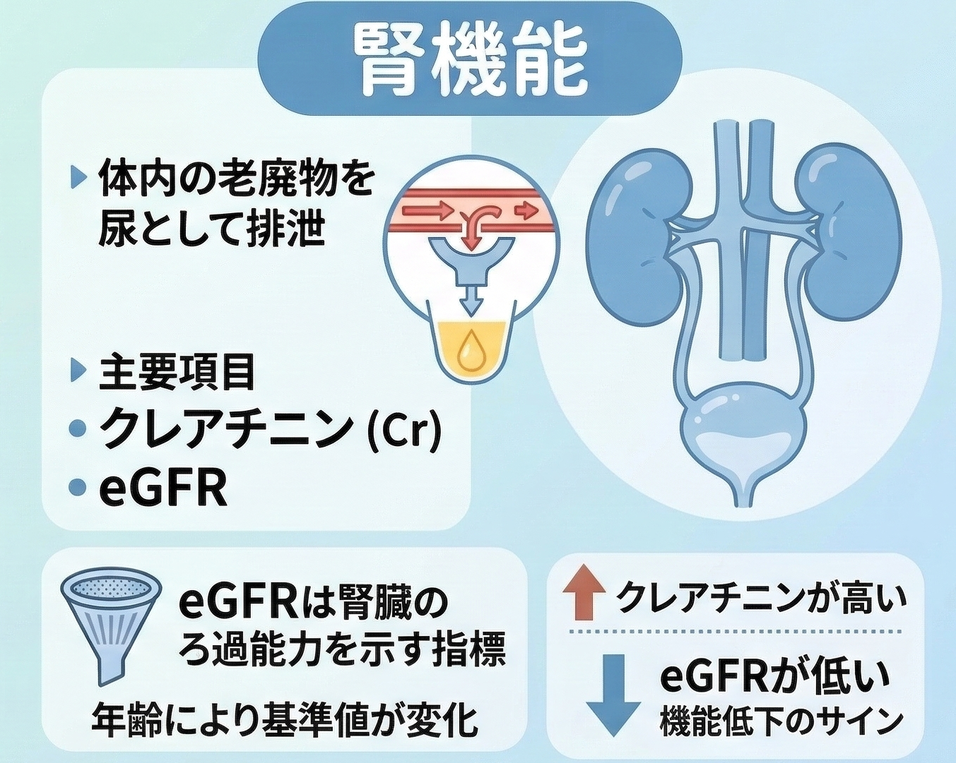 代表的な検査は クレアチニン(Cr)eGFR です。