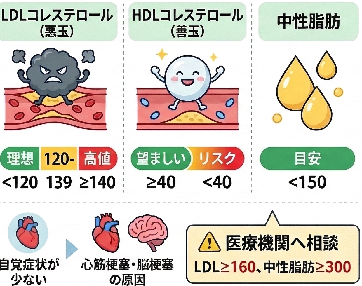 主な項目は LDLコレステロール(悪玉)、HDLコレステロール(善玉)、中性脂肪 です。