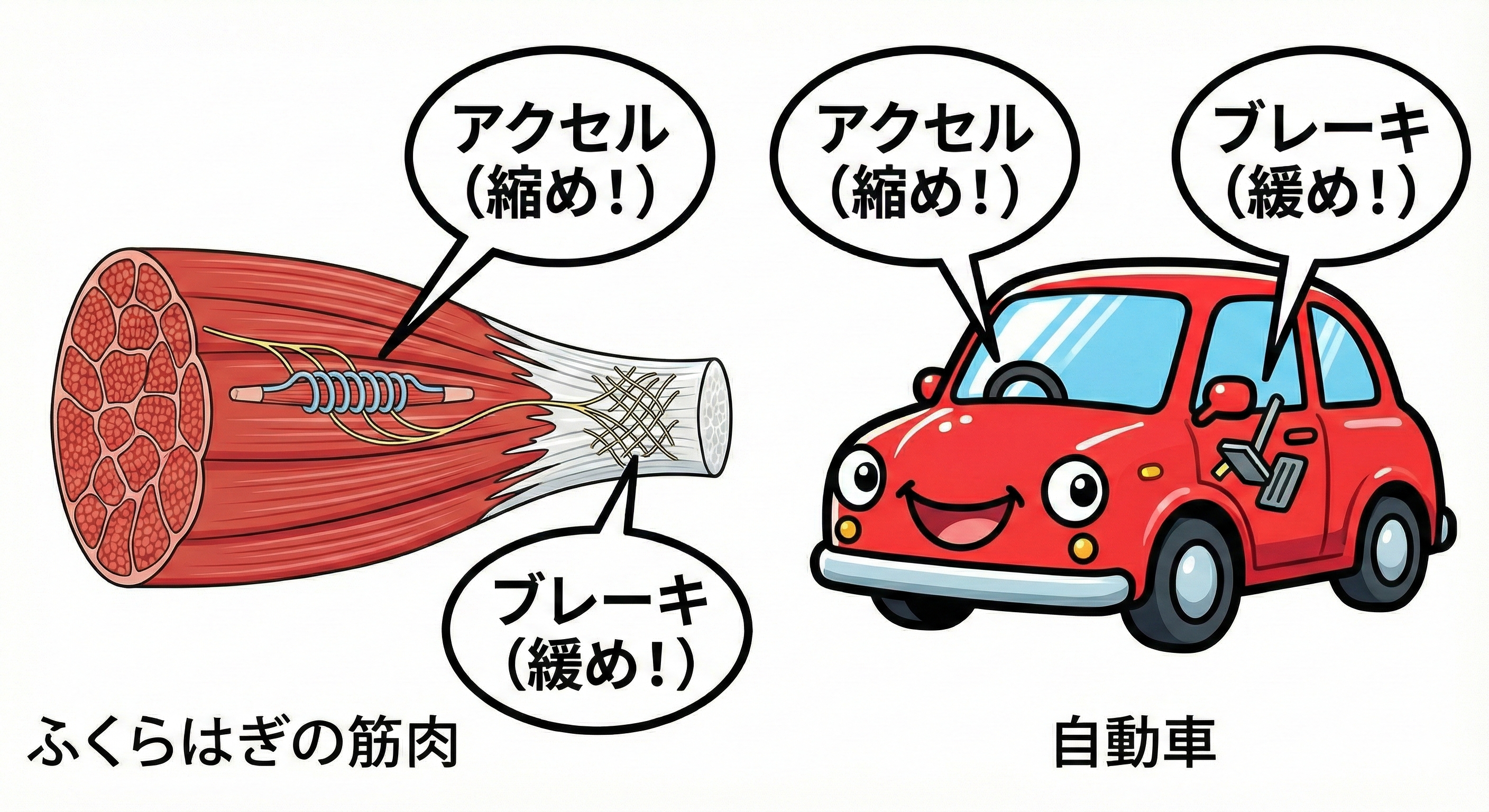 私たちの筋肉には、実は「2つの優秀なセンサー」がついています。これを「車」に例えると非常に分かりやすくなります。