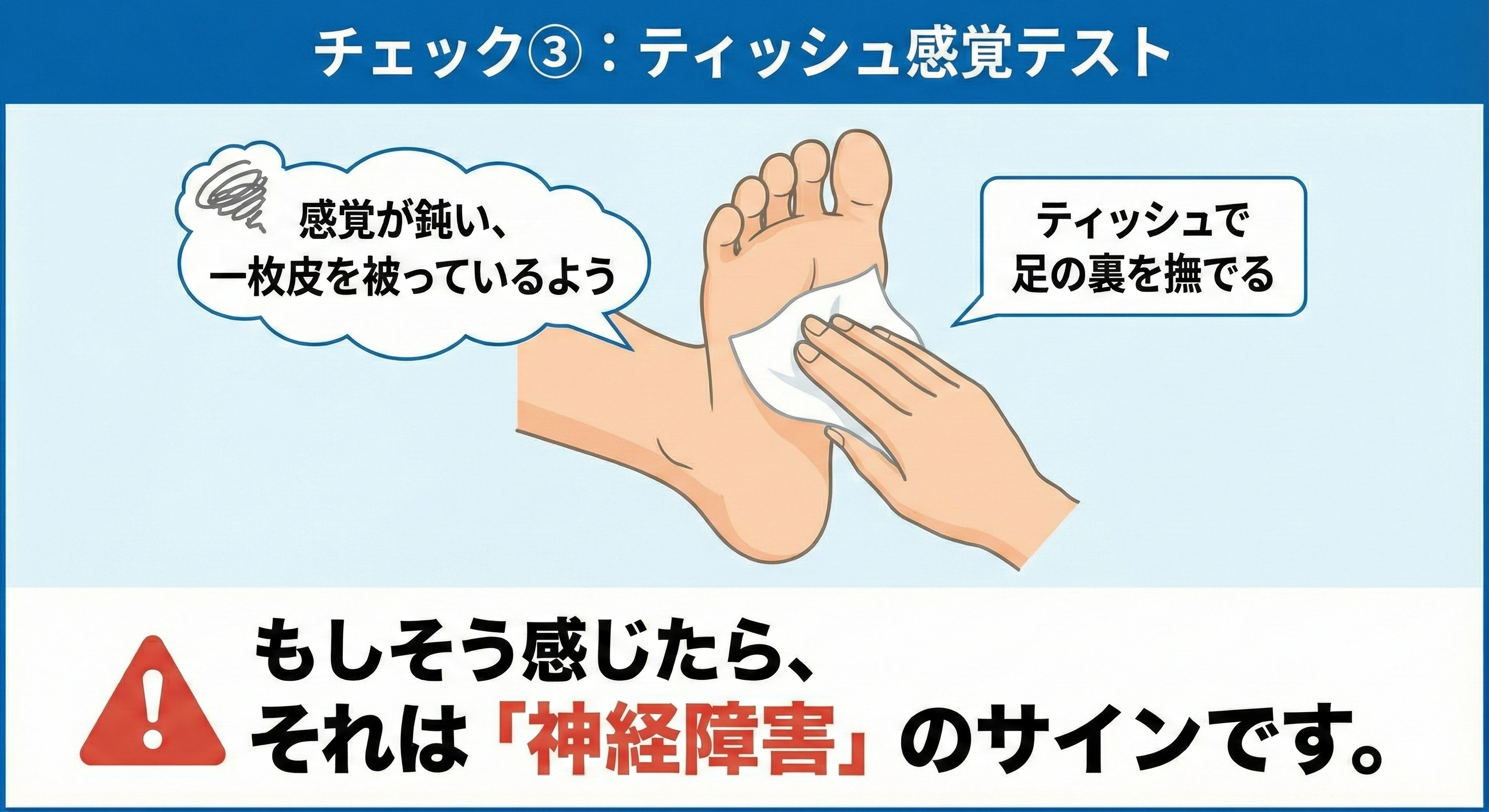 もし「触っている感覚が鈍い」「一枚皮を被っているようだ」と感じたら、それは「神経障害」のサインです。
