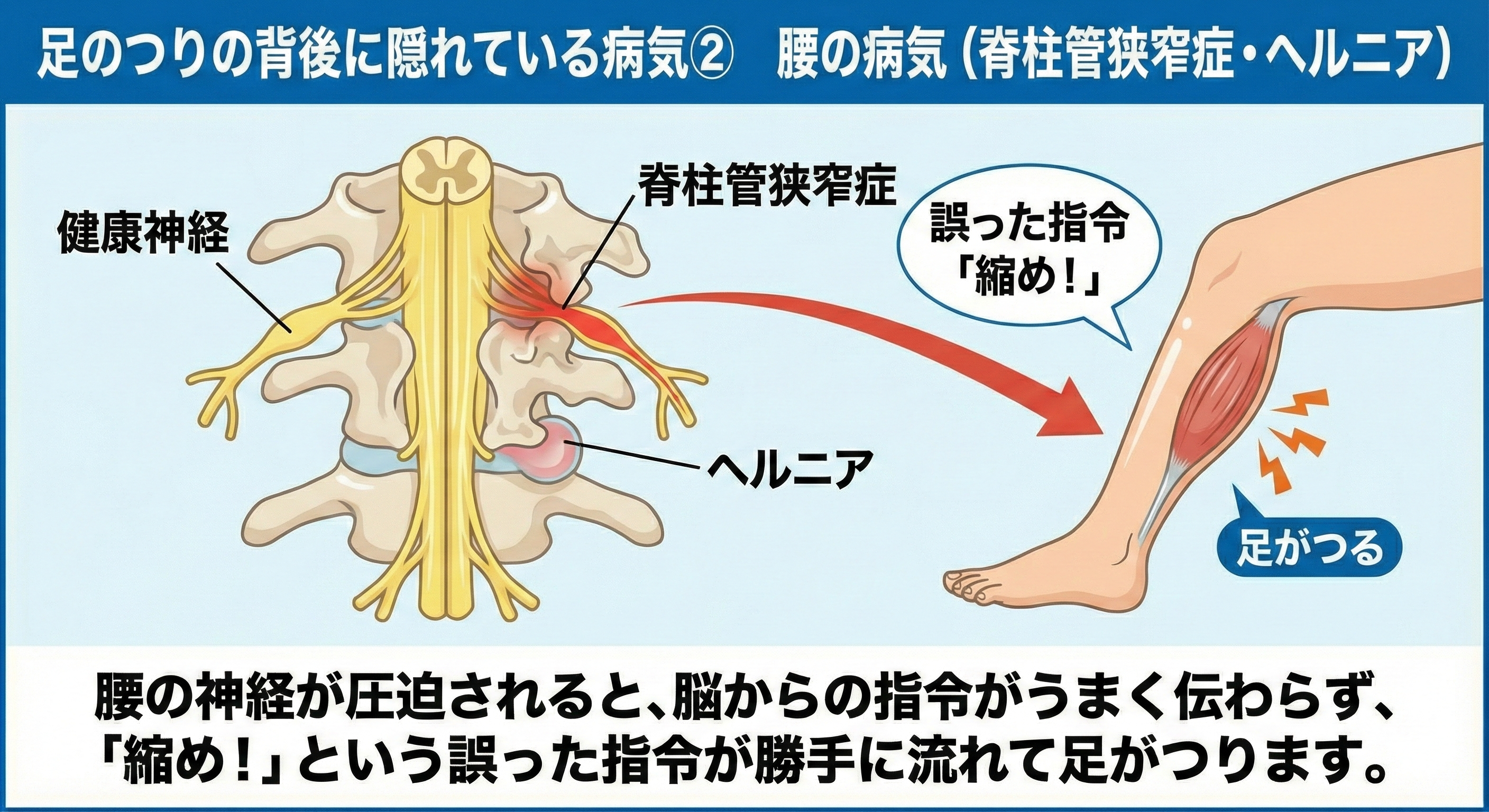 腰の骨が変形したりヘルニアになったりして神経が圧迫されると、脳からの指令がうまく伝わらなくなります。「縮め!」という誤った指令が勝手に流れてしまい、足がつります。