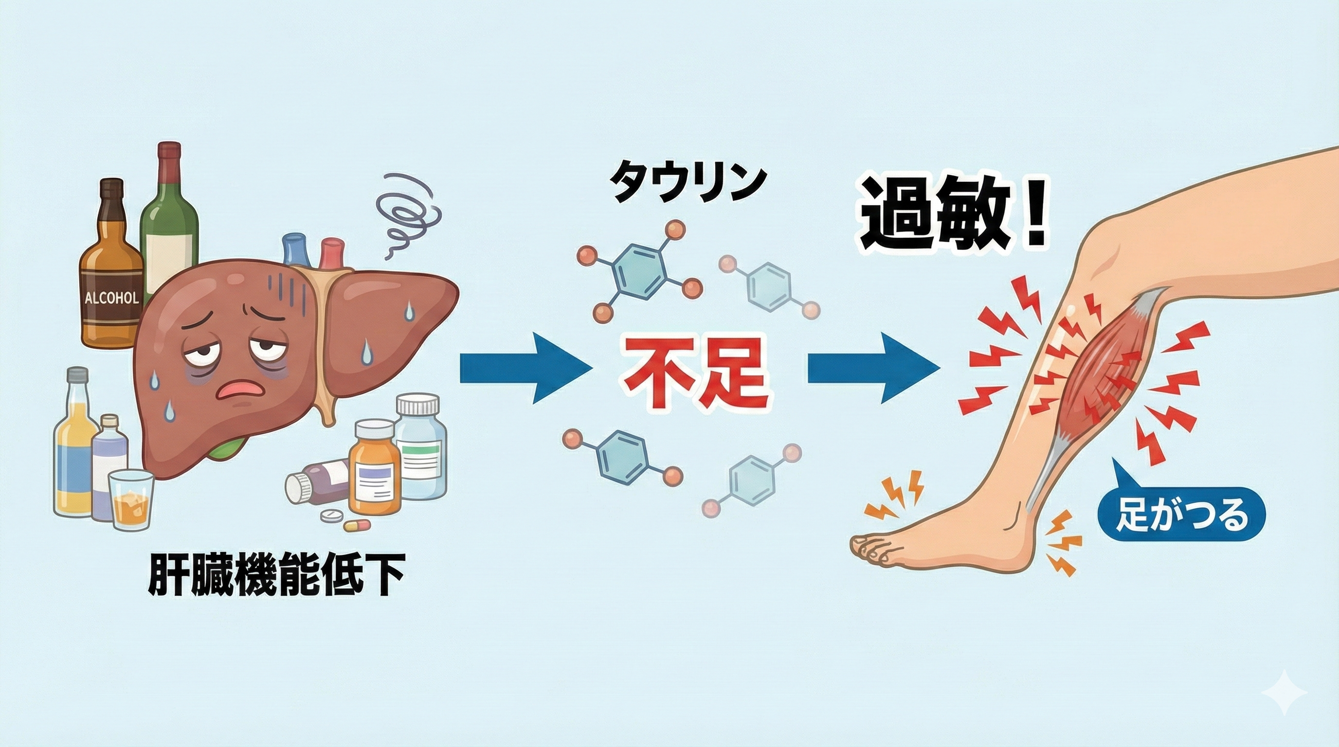 また、実は肝臓の機能が低下するとアミノ酸の一種である「タウリン」が不足し、筋肉が過敏になって足がつりやすくなることが医学的に分かっています [参考文献1]。
