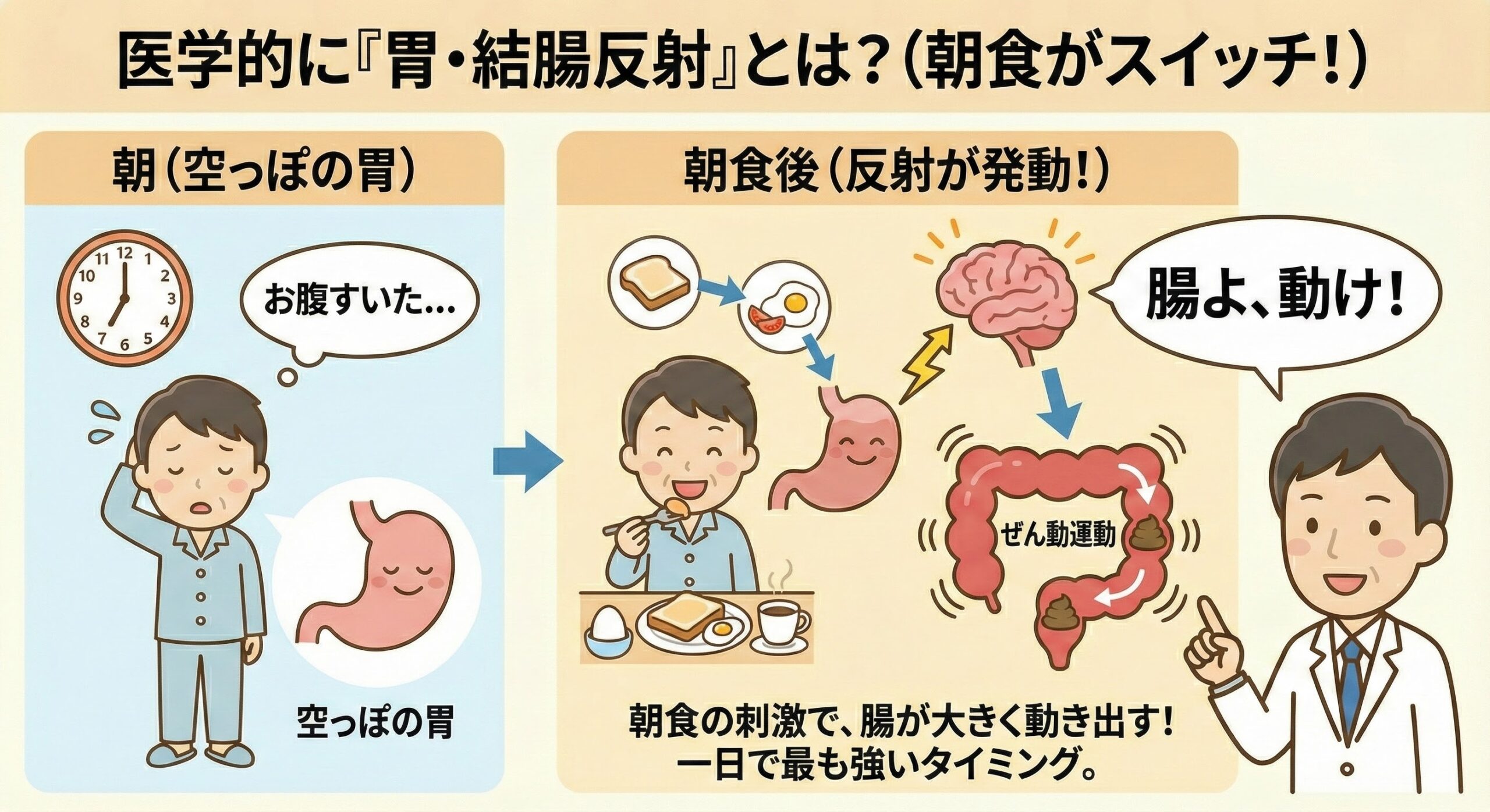 医学的に『胃・結腸反射(い・けっちょうはんしゃ)』という言葉があります。 空っぽの胃に朝食が入ると、その刺激で脳が『腸よ、動け!』と指令を出し、腸が大きくぜん動運動を始めます。 これは朝食後が一日で最も強いと言われています。