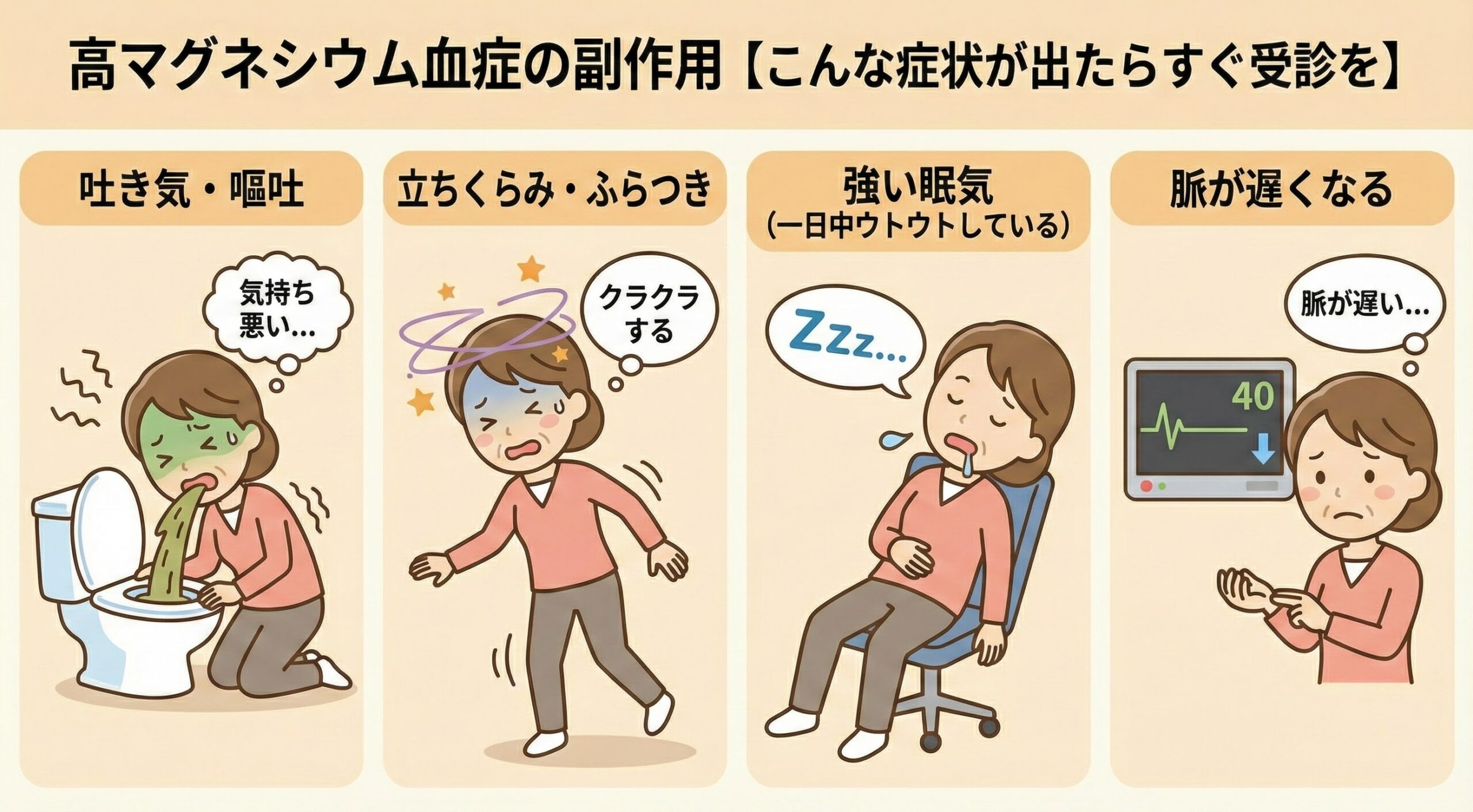最も注意が必要な副作用です。血液中のマグネシウム濃度が異常に高くなり、最悪の場合、心停止に至る可能性があります。