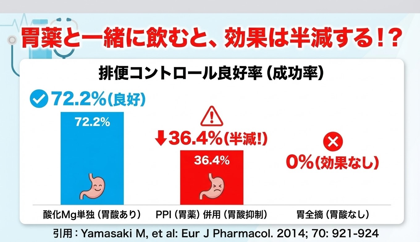 - ※3:Yamasaki M, et al. Eur J Pharmacol. 2014 Nov 15;743:123-7. (胃酸分泌抑制薬PPIの併用が酸化マグネシウムの緩下作用に与える影響)