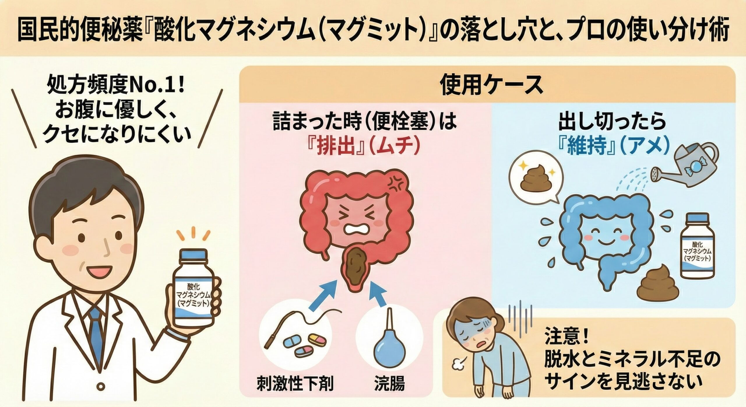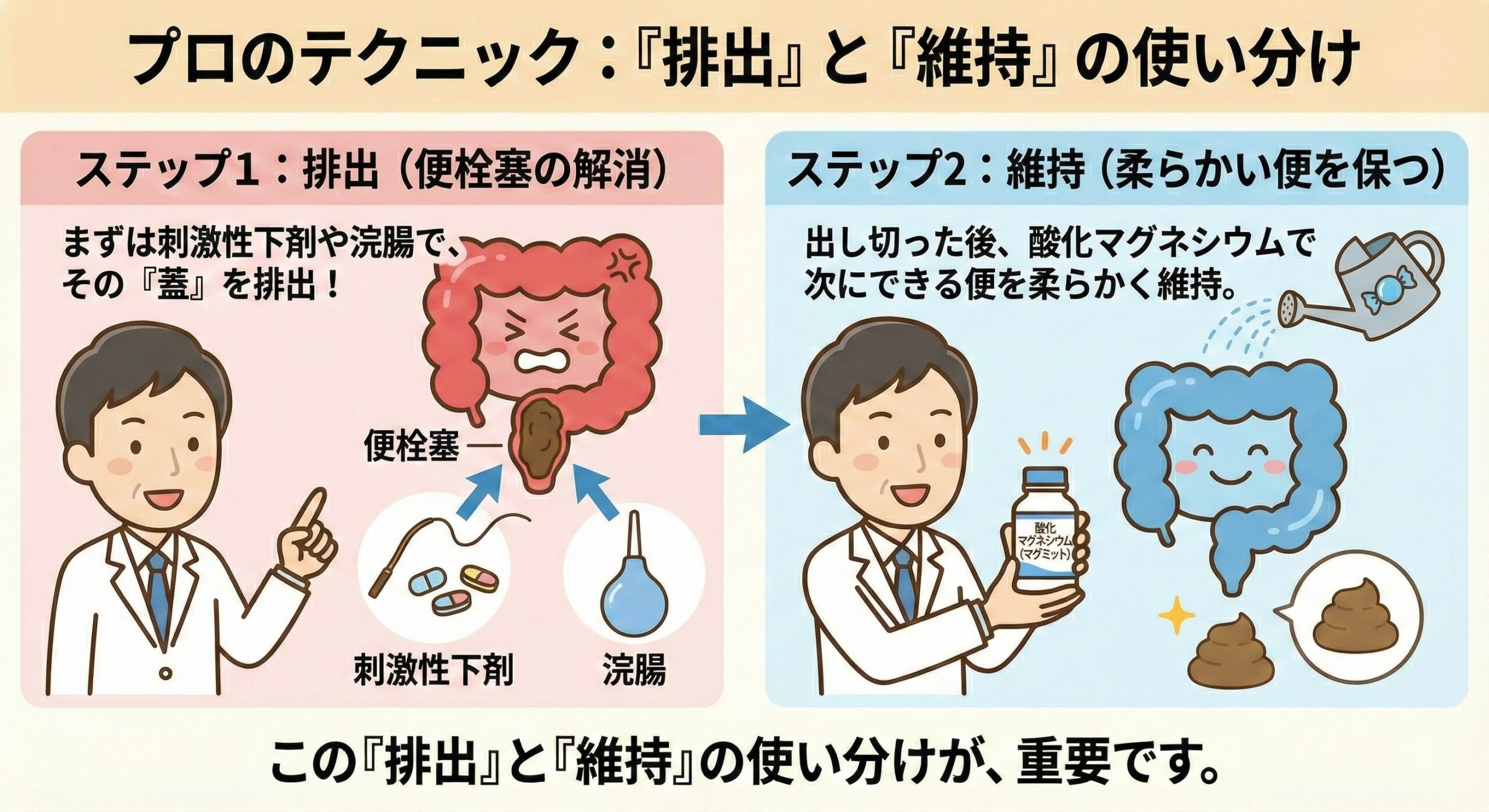 すでに出口で詰まっている(便栓塞)場合は、まずは刺激性下剤や浣腸などを使って、その『蓋』を排出するのが先決です。 そして、出し切った後、『次にできる便が硬くならないように』酸化マグネシウムで維持する。 この『排出』と『維持』の使い分けが、プロのテクニックです。