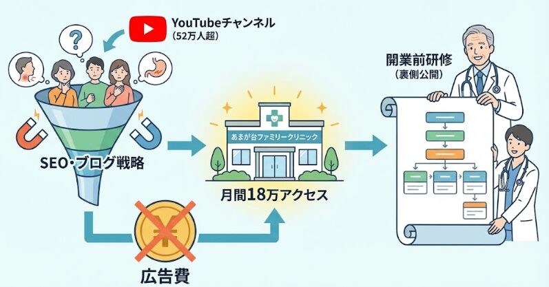 登録者52万人超のYouTubeチャンネル、月間18万アクセスのサイト運営、SEO・ブログ戦略など、「広告費に頼らずとも特定の悩みを持つ患者さんが集まる導線」の裏側を、開業前研修の先生には包み隠さず公開します。