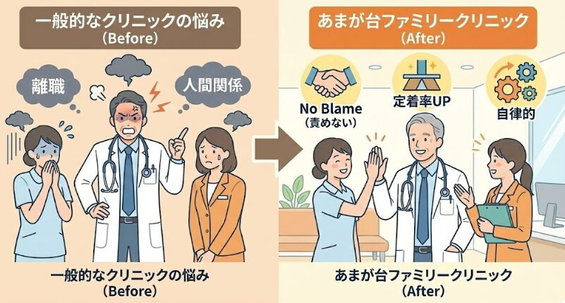 当院では「No Blame(責めない文化)」や「理念共有の朝礼」を通じ、スタッフが自律的に動き、離職が極めて少ない組織を実現しています。