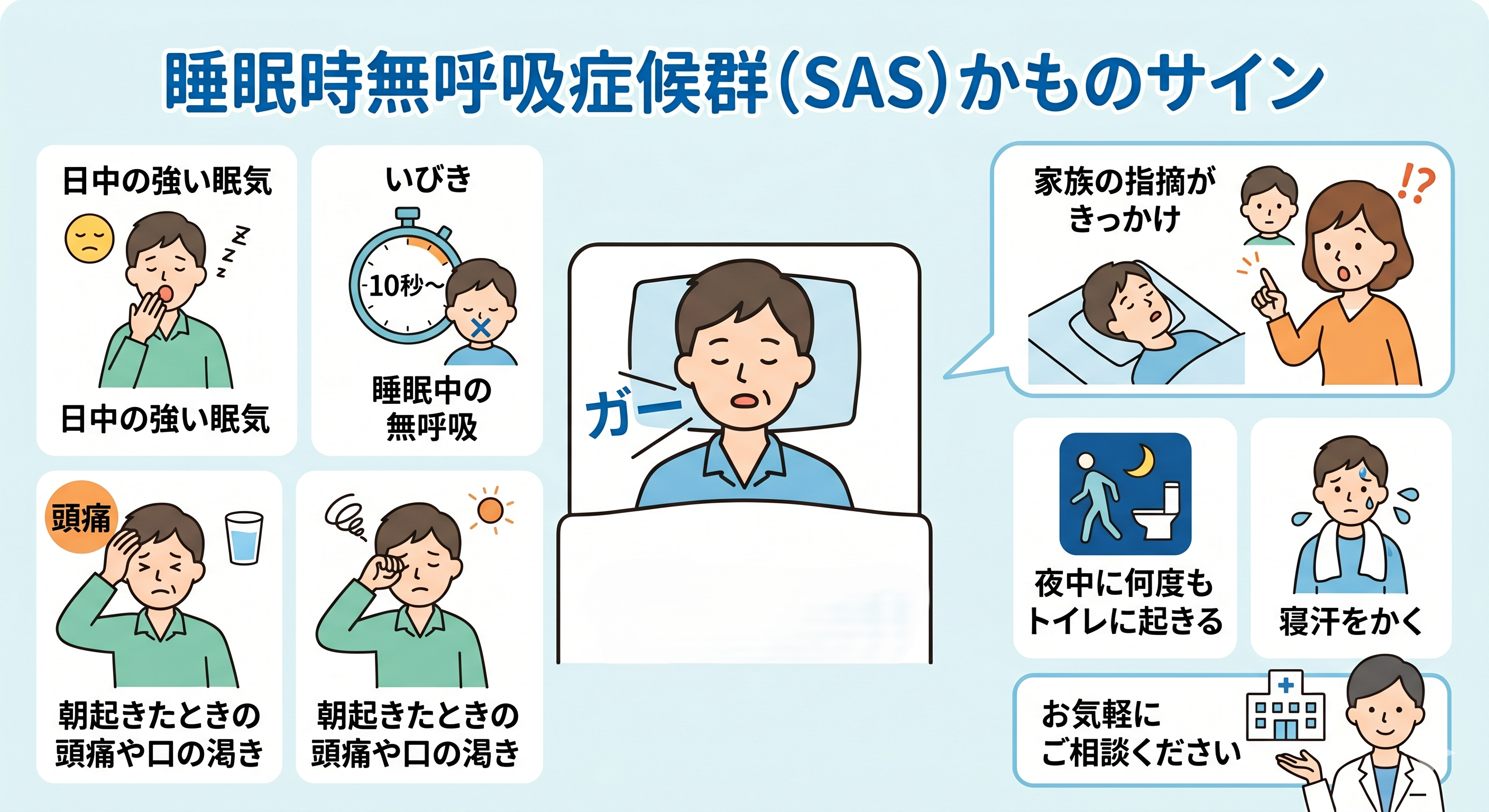 もし当てはまるなら、それは「睡眠時無呼吸症候群(SAS)」のサインかもしれません。