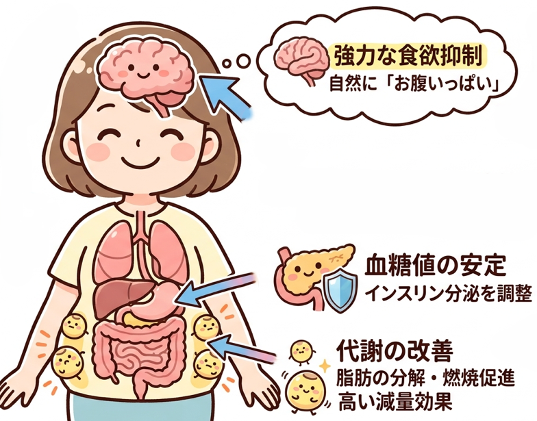 • 食欲の強力な抑制:脳の満腹中枢に働きかけ、自然と「お腹がいっぱい」と感じるようになります 。
