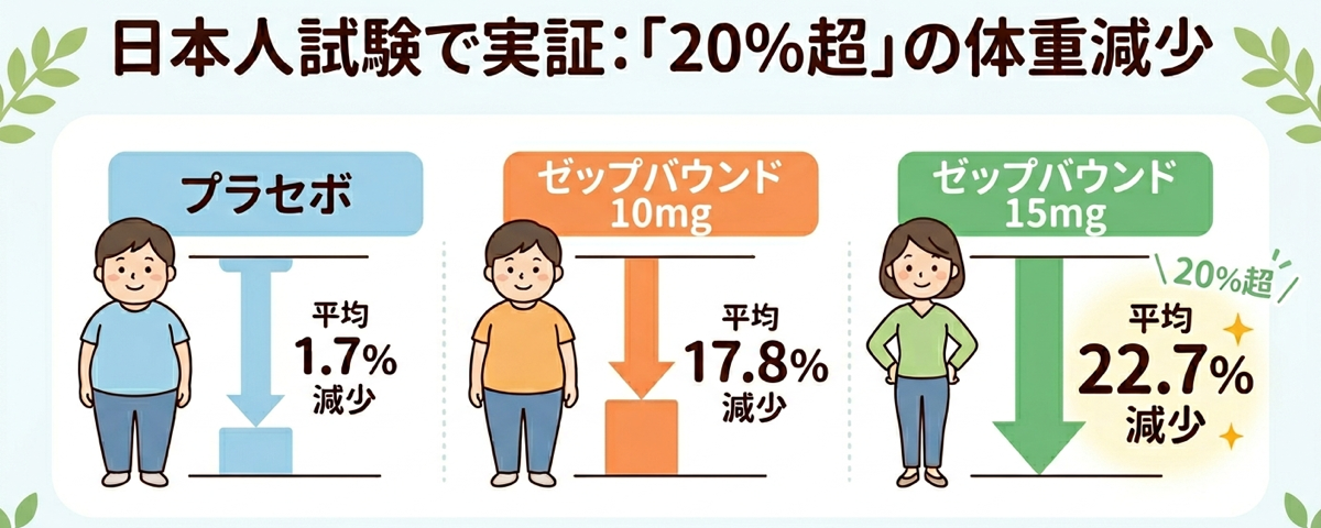 ゼップバウンドの最大級のメリットは、日本人を対象とした厳格な臨床試験(SURMOUNT-J試験)において、その圧倒的な有効性が実証されている点にあります 。